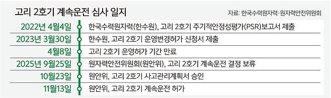 한수원은 고리 2호기 계속운전을 위해 부단히 애썼다. 설계수명 만료 1년을 앞둔 2022년 4월4일 고리 2호기 계속운전을 위해 ‘원자력안전법’에 따라 주요기기 수명평가 등 주기적 안전성평가 결과를 제출했다. 이듬해 3월에는 주민의견 수렴을 거친 방사선환경영향평가서(RER)를 첨부한 운영변경허가 서류도 제출했다. 한국원자력안전기술원(KINS)은 약 3년4개월간 안전성 심사를 진행했고, 원자력안전전문위원회는 약 7개월간 KNIS 심사 결과에 대한 사전 검토를 수행해 심사 결과가 적합하다고 판단했다. 하지만 이 과정에서 논란과 진통이 끊이지 않았다.