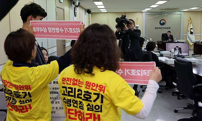 환경단체는 반발 탈핵시민행동 등 시민·환경단체 활동가들이 13일 서울 중구 원자력안전위원회 회의실에서 고리 2호기 계속운전 심의 중단을 촉구하고 있다. 뉴스1