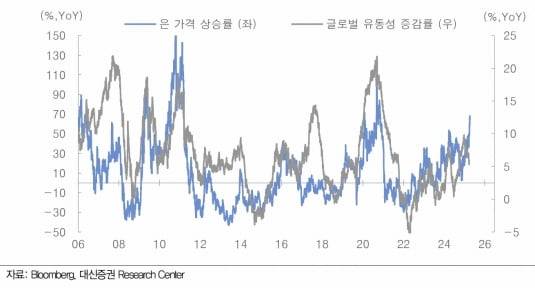 최진영 대신증권 연구원은 "금값은 기준금리 인하 기대가 커질 때 상승하고 은값은 유동성이 팽창할 때 올랐다"며 "은 가격이 각국 중앙은행의 정책금리 변화를 18개월가량 후행해서 움직이는 것을 고려하면 2027년 6월까지 상승세를 이어갈 수도 있다"고 분석했다.