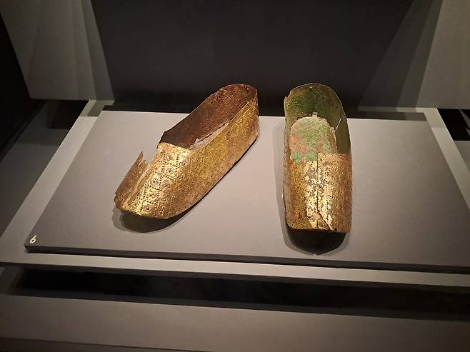 | ▲ 국립 익산 박물관에 전시된 입점리 출토 금동 신발 |