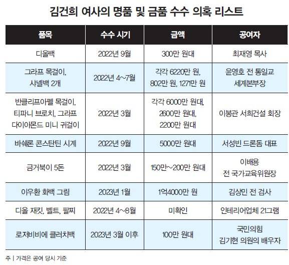 하지만 올해 7월 특검이 출범한 이후로는 김 여사의 명품 수수 의혹의 실체가 줄줄이 드러나고 있다. 먼저 김 여사가 통일교 측이 건넨 6220만 원 상당의 그라프 다이아몬드 목걸이와 2000만 원 상당의 샤넬백 2개를 받은 정황이 포착됐다. 특검은 2022년 4~7월 윤영호 전 통일교 세계본부장이 '건진법사' 전성배 씨를 통해 이 물건들을 건넸으며, 김 여사는 물품 대가로 통일교 현안 청탁을 받았다고 의심했다.특검은 8월 실물 확보를 하지 못한 채 정황 증거를 근거로 김 여사를 특정범죄가중처벌법상 알선수재 등 혐의로 구속기소했는데, 재판 도중 전 씨가 그동안 행방불명이던 가방과 목걸이를 제출하면서 퍼즐이 맞춰졌다. 김 여사는 11월 5일 줄곧 수수한 적 없다고 밝혔던 입장을 뒤집고 가방 2개를 받았다는 사실을 인정했다. 하지만 다이아몬드 목걸이는 받은 적이 없고, 건네받았던 가방들 또한 모두 전 씨에게 반환했다며 통일교와의 공모나 청탁·대가 관계는 없었다고 주장했다.