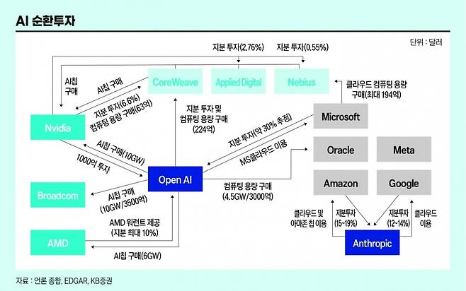 “오픈AI는 현재 AMD의 지분 10%를 인수하고 있으며 엔비디아는 오픈AI에 1000억 달러를 투자하고 있다. 오픈AI의 주요주주 중에는 마이크로소프트(MS)가 있다. MS는 엔비디아가 상당한 지분을 보유하고 있는 또 다른 회사인 AI 클라우드 컴퓨팅 회사 코어웨이브의 주요 고객이기도 하다. 또 2025 회계연도 4분기 기준으로 MS는 엔비디아 연간 매출의 약 20%를 차지했다. 이쯤 되면 이런 의문이 든다. ‘이건 마치 무법지대의 서부개척시대처럼 거래만 성사되면 뭐든 허용되는 시대 아닌가?’ 매출과 지분의 경계가 흐려지고 있다.”