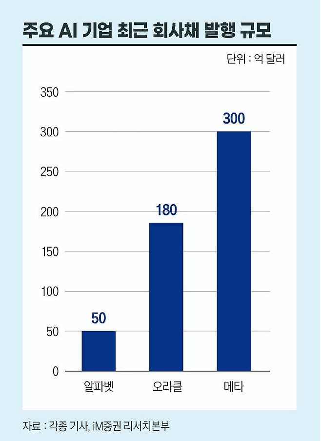 이 문제는 최근 들어 빅테크가 ‘빚투’로 AI에 투자하면서 불을 지폈다. 오라클이 180억 달러에 달하는 회사채를 발행한데 이어 메타, 알파벳 역시 AI 관련 투자를 위해 회사채 발행을 계획했다. 다행히 대규모 회사채 발행에도 불구하고 이들 회사채는 투자자들의 관심 속에 무난히 자금조달에 성공했다. 그러나 경고음도 울린다. 오라클의 CDS 프리미엄 급등과 미국 AAA 회사채 금리의 급등 등이다. 박상현 iM증권 애널리스트는 “AI 사이클이 본격적인 보급률 확산 국면에 접어들고 있고 미·중은 물론 주요국들이 경쟁적으로 AI 투자에 나설 수밖에 없는 환경을 고려하면 AI 투자 과잉을 논할 단계는 아니다”라면서도 “대형 AI 기업들의 대규모 자금조달의 풍선효과와 차입 리스크가 커지고 있음은 앞으로 경계해야 할 부분”이라고 말했다.