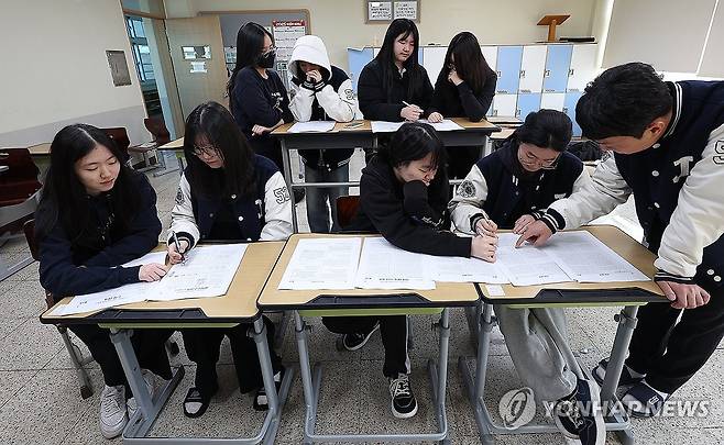 (대구=연합뉴스) 윤관식 기자 = 2026학년도 대학수학능력시험(수능) 다음날인 14일 대구 수성구 정화여자고등학교 3학년 교실에서 수험생들이 가채점하고 있다. 2025.11.14
