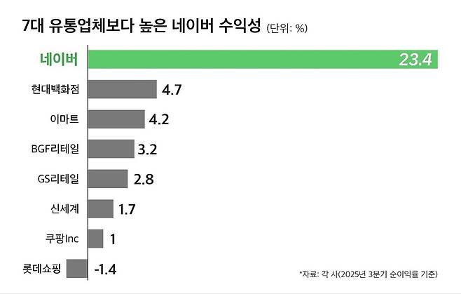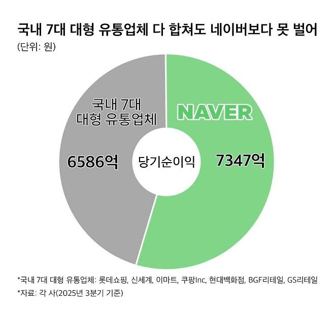 14일 네이버와 7대 유통사 쿠팡Inc·이마트(139480)·신세계·롯데쇼핑(023530)·현대백화점(069960)·GS리테일(007070)·BGF리테일(282330)의 3분기 실적공시를 비교한 결과, 네이버의 당기순이익은 7347억 원으로, 7대 유통기업의 합산 순이익(6586억 원)보다 11.5% 높은 것으로 집계됐다.
