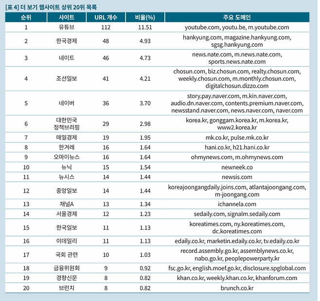 ‘더 보기 웹사이트 상위 20위’에선 2위 한국경제(46개), 4위 조선일보(41개), 7위 매일경제(19개), 8위 한겨레(16개), 9위 오마이뉴스(16개), 11위 뉴시스(14개), 12위 중앙일보(14개), 13위 채널A(13개), 14위 서울경제(12개), 15위 한국일보(11개), 16위 이데일리(11개), 19위 경향신문(8개) 순이었다.