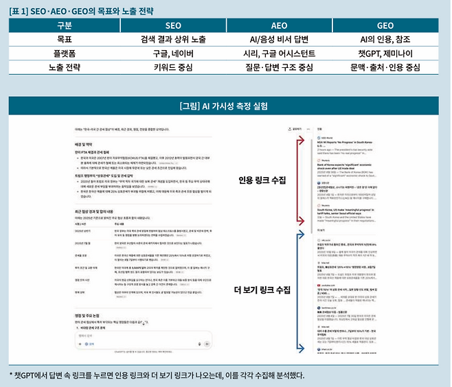 한국언론진흥재단은 <신문과방송> 11월호 커버스토리 ‘AI 검색에 가장 많이 등장한 언론사는?’(김민기 슬리버 대표) 기사를 통해 국내 언론사들의 AI 가시성을 측정한 실험 결과를 전했다. 특정 키워드를 검색했을 때 관련 링크가 페이지 상단에 위치하게 만드는 ‘SEO’(검색엔진 최적화), 음성 비서나 AI 챗봇(애플 시리, 구글 어시스턴트)이 콘텐츠를 직접 인용·요약해 사용하게 하는 ‘AEO’(답변엔진 최적화)를 거쳐 GEO 대응이 요구되는 여건이다.