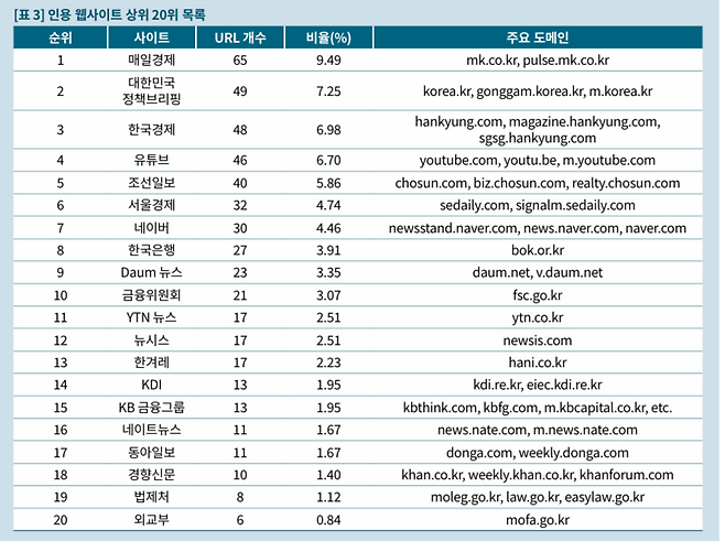 실험 결과 ‘인용 웹사이트 상위 20위’에선 경제지가 다수 상위권을 차지했다. 기성언론사만 살펴보면 1위 매일경제(URL 65개), 3위 한국경제(48개), 5위 조선일보(40개), 6위 서울경제(32개), 11위 YTN뉴스(17개), 12위 뉴시스(17개), 13위 한겨레(17개), 17위 동아일보(11개), 18위 경향신문(10개) 등이었다.