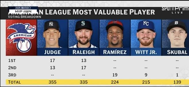 지난 시즌 아메리칸리그 MVP를 만장일치로 수상했던 저지지만, 올해는 만장일치는 아니었다. 아니 가까스로 수상했다는 말이 더 정확할 듯 하다. 1위표 17장, 2위표 13장을 받아 총점 355점으로 1위표 13장, 2위표 17장을 받은 랄리(335점)를 제치고 MVP에 선정됐다.