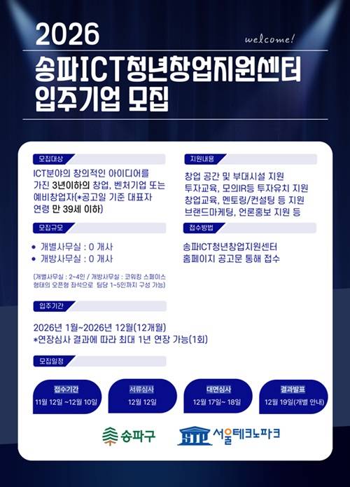 송파구 가락IT벤처타워 서관 11층에 위치한 '송파ICT청년창업지원센터(이하 송파ICT)'가 2026년 입주기업을 모집한다.