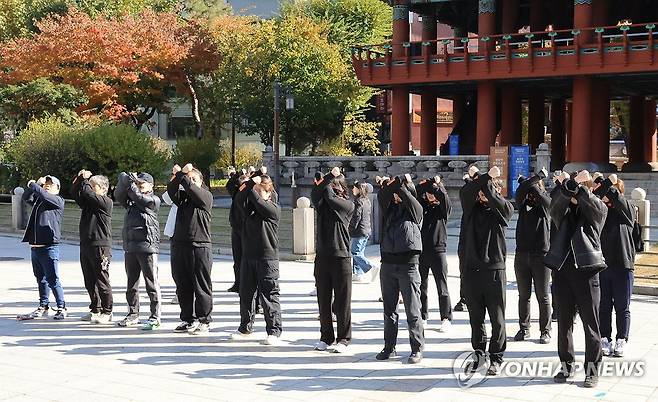 (서울=연합뉴스) 최재구 기자 = 세계 여성 폭력 추방 주간을 맞아 14일 서울 종각 앞에서 한국여성의전화 관계자들이 여성 살해 규탄 퍼포먼스 '114번의 신고 114번의 실패'를 준비하고 있다. 2025.11.14