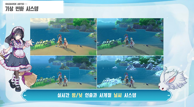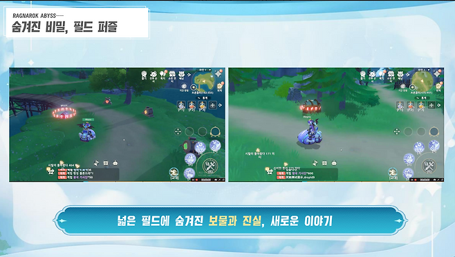 A. 필드에서 진행하는 탐험, 보물 찾기, 미션 등 콘텐츠는 원하는 파트너와 함께 풀어나갈 수 있도록 기획했다. 또한 라그나로크 어비스는 오픈 월드를 더 강조하기 위해 마을과 필드를 원 맵으로 구성하는 등 하나의 세계에서 플레이하는 느낌이 들 수 있도록 개발했다.