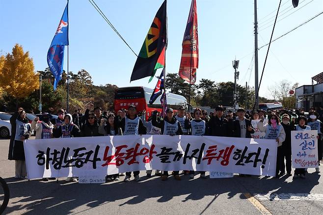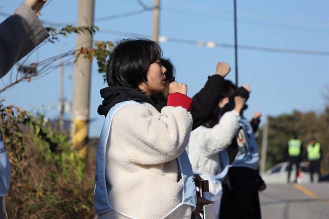 | ▲ 서울에서 오전 6시 30분에 출발해 화성까지 달려온 청년 연대자들은 해고노동자들의 부당해고 철회와 비정규직 노동자 문제에 노동자들이 관심을 가져야 할 것을 촉구하는 구호를 외쳤다. |