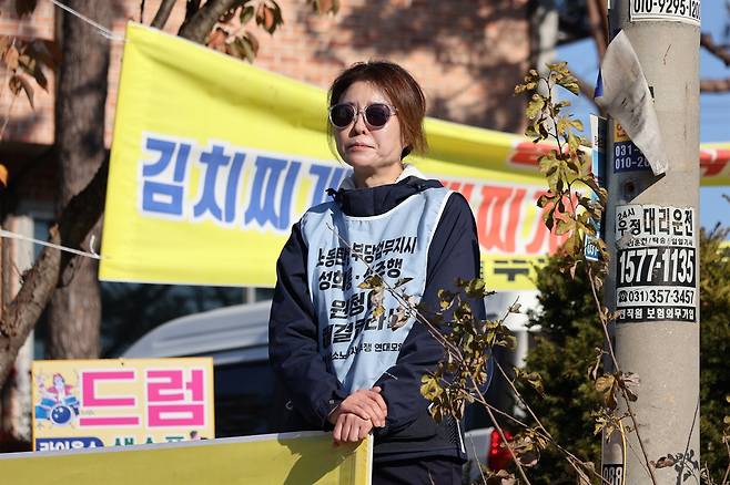 | ▲ 해고 당사자인 김경숙 금속노조 기아차비정규직지회 조합원이 부당해고 철회를 주장하는 몸자보를 입고 선전전 현장에 서 있다. |