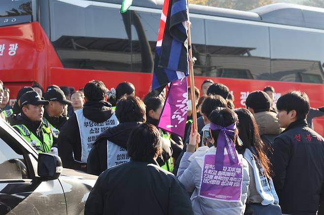 | ▲ 이날 기아 사측은 경비노동자 및 관리자를 선전장 인근에 배치해 노동자들과 대치했다. 심지어 이들은 서울에서부터 온 연대자들의 화장실 이용까지도 저지하는 등 과도한 통제로 마찰을 야기하기도 했다. |