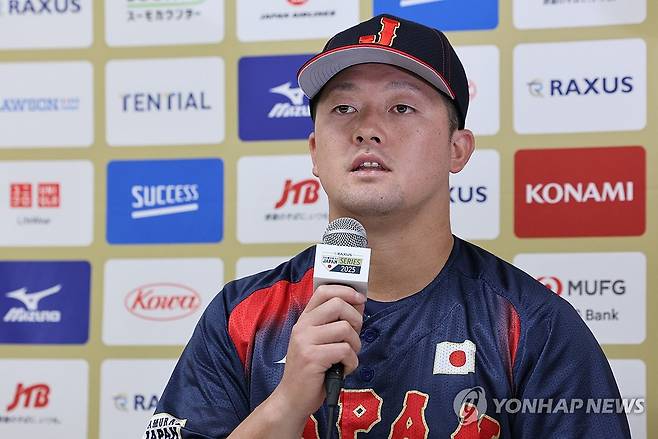 (도쿄=연합뉴스) 이동해 기자 = 일본 야구대표팀 마키 슈고가 14일 일본 도쿄돔에서 월드베이스볼클래식(WBC) 대비 한일 평가전을 앞두고 열린 공식 기자회견에서 발언하고 있다. 2025.11.14