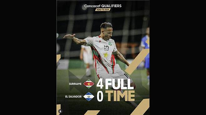 수리남은 14일(한국시간) 수리남 파라마리보의 프랭크 에세드 스타디온에서 열린 2026 북중미 월드컵 북중미 예선 3차 예선 A조 5차전 홈 경기에서 엘살바도르(94위)를 4대 0으로 격파했습니다.