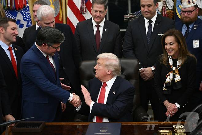 (워싱턴 AFP=뉴스1) 김경민 기자 = 도널드 트럼프 미국 대통령이 12일(현지시간) 워싱턴DC 백악관에서 연방 정부 셧다운(일시적 업무 정지)을 끝내기 위한 임시 예산안에 서명한 후 마이크 존슨 하원의장과 악수를 하고 있다. 2025.11.12
