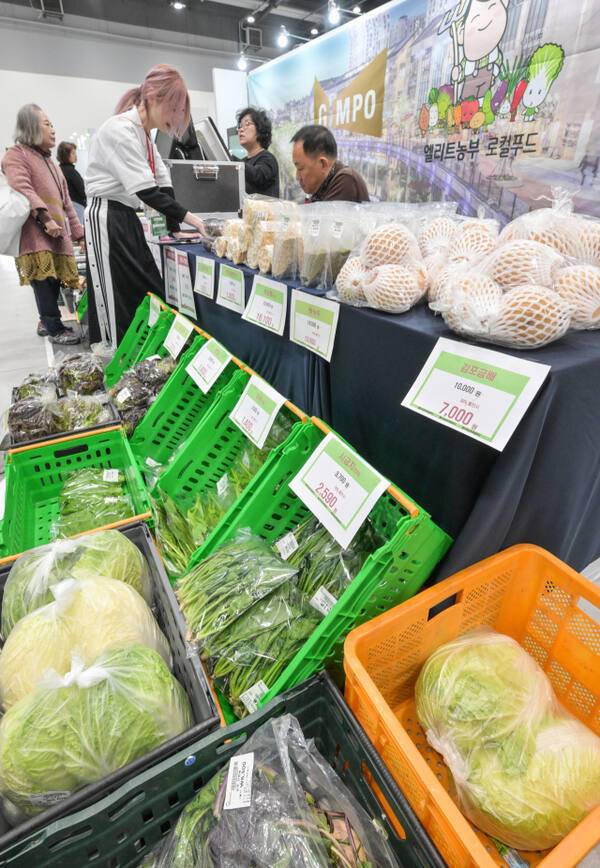 김포시 행사 부스를 찾은 관람객들이 채소를 구매하고 있다.