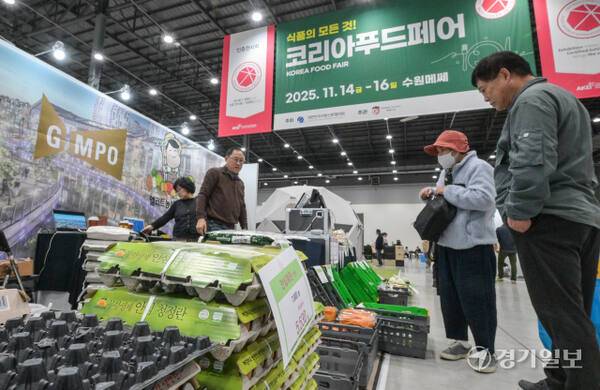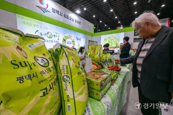 14일 오후 수원메쎄에서 열린 '2025 코리아푸드페어'를 찾은 관람객들이 평택시 농산특산물 슈퍼오닝을 구경하고 있다.