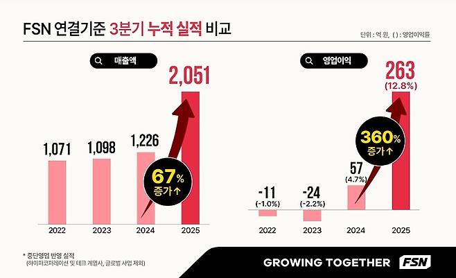 FSN이 올해 3분기 연결기준 누적 매출액 2,051억 원, 영업이익 263억 원을 달성했다고 공시를 통해 밝혔다. 이는 전년 동기 대비 매출액은 67%, 영업이익은 360% 증가한 수치로, 매출과 영업이익 모두 창사 이래 동기 최대치를 달성하게 됐다.