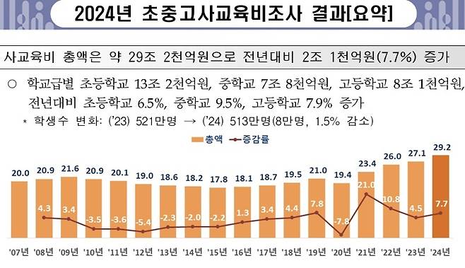 | ▲ 2024년 초중고 사교육비 조사 결과 올해 3월 발표된 2024년 초중고 사교육비 조사 결과를 보면, 코로나19 여파가 미친 2020년을 제외하고 사교육비가 꾸준히 증가했음을 알 수 있다. |
