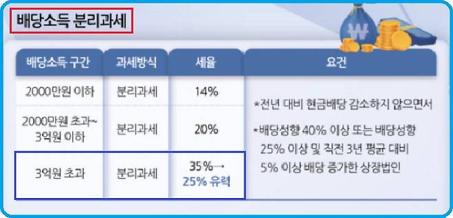 이슈(Issue)가 되고 있는 ‘배당소득 분리과세’란 연간 2000만 원을 초과하는 고액의 배당소득에 대해서도 종합과세 대신 일정 세율을 적용하여 분리해 과세하자는 취지의 절충안이다. 고액의 배당소득에 대해 종합소득세의 높은 누진세율(지방세 포함 최고 49.5%)를 적용하는 대신 별도의 낮은 세율로 과세해서 주식시장을 통한 배당수익에 부과하는 고율의 세금징구에 대한 부담을 줄여 증시로 자금유입을 촉진하기 위한 조치인 것이다. 고배당 기업 투자를 통한 배당소득 등 특정조건의 배당소득에 대해 최고세율을 25% 수준으로 분리과세를 적용하는 방안이 논의 중이라 시장에서는 긍정적으로 해석하고 있다.
