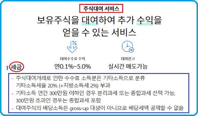 주식대여에 있어 기억할 점은 이러한 주식대여 수수료는 기타소득에 해당되어 수수료를 지급받을 때 22%의 세율(지방소득세 포함)로 원천징수를 하게 된다는 것과, 만약 1년간 받은 주식대여 수수료 등 기타소득금액이 연간 300만 원을 넘는 경우에는 다른 소득과 합산하여 종합소득세 신고를 해야 된다는 것이다.