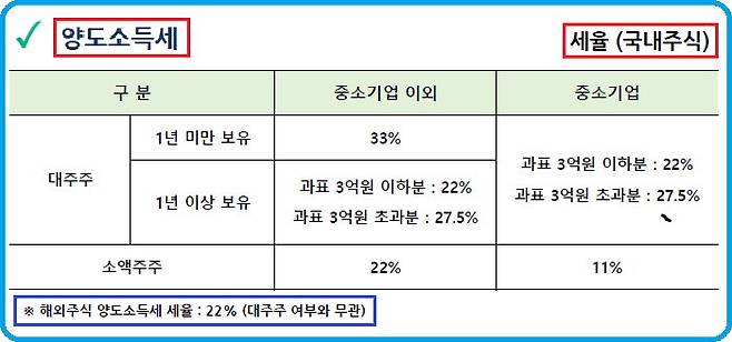 지난 7월 정부가 대주주 기준을 시가총액 10억 원으로 낮춘다고 하면서 시장이 크게 흔들리기도 했지만 정치권과 투자자들의 반발, 그리고 대통령의 발언까지 이어진 논의 끌에 최종적으로 현행 시가총액 요건인 50억 원으로 유지되기로 했다. 국내 상장주식일 경우 양도소득세가 중소기업인지 중소기업 이외인지에 따라 세율이 달리 적용된다. 여기다 소액주주와는 달리 대주주의 경우에는 1년 이상과 1년 미만 보유를 구분해 양도소득세를 부과한다.