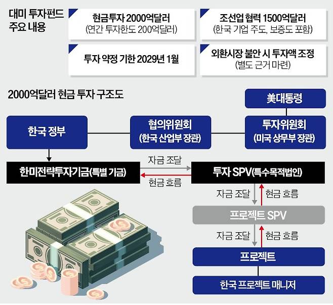 총 3500억달러 규모의 대미 전략적 투자는 2000억달러의 일반 투자와 1500억달러의 조선 협력 투자로 구성된다. 조선 협력 투자에는 외국인직접투자(FDI), 보증, 선박금융 등이 포함된다.