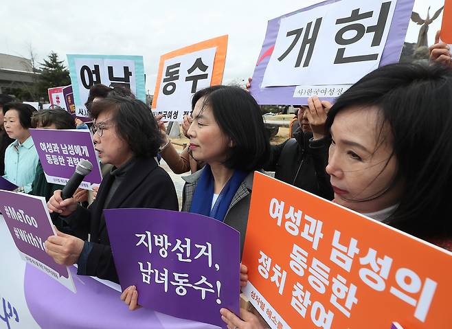 | ▲ 2018년 3월 19일, 여성단체들이 청와대 분수대 앞에서 기자회견을 열어 '여남 동수 개헌', '여성과 남성의 동등한 정치 참여 보장'을 요구하며 성차별 해소를 위한 개헌을 촉구했다. |