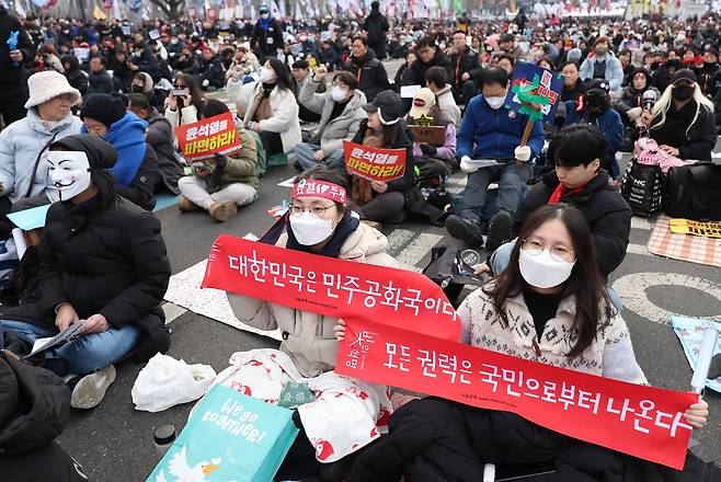 | ▲ 2월 25일 윤석열 즉각퇴진·사회대개혁 비상행동이 서울 종로구 광화문 일대에서 연 11차 범시민대행진에서 참석자들이 손팻말을 들고 있다 |