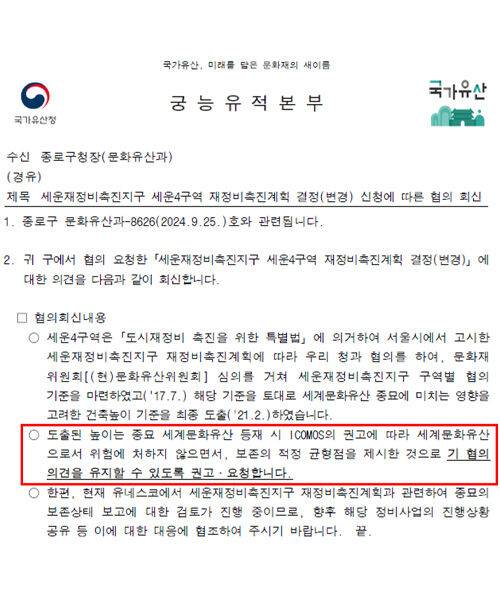 국내 첫 유네스코 세계문화유산인 종묘 맞은편 세운4구역 고층 건물 재개발 논란이 이어지는 가운데, 과거 유네스코 측에서 "122m 건물을 지어도 된다"는 의견을 전했다는 서울시의 주장과 배치되는 유네스코의 공식 입장이 나왔습니다.