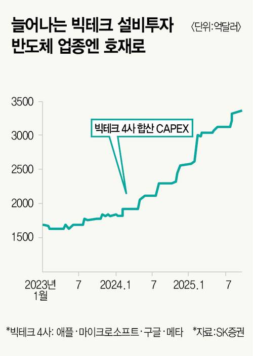 반도체는 이익 확대 가능성에 널뛴다. 글로벌 빅테크가 설비투자(CAPEX) 확대를 예고하면서다. 메타는 최근 3분기 실적 설명회에서 연간 설비투자(CAPEX) 전망치 하단을 기존 660억달러에서 700억달러로 높였다. 구글 모회사 알파벳도 3분기 실적 설명회에서 설비투자 가이던스를 850억달러에서 910억~930억달러로 조정했다. 빅테크 설비투자 대부분은 데이터센터 등 AI 인프라 용도로 풀이된다. 이를 고려하면 빅테크 설비투자 확대는 고대역폭 메모리 반도체(HBM) 시장에 긍정적 요소다.