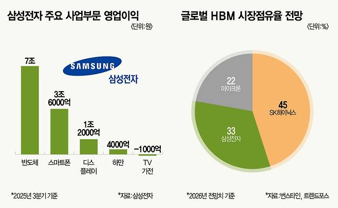 특히 DS부문 맏형 격인 메모리사업부가 3분기에만 매출 26조7000억원을 기록해 분기 기준 역대 최대 매출을 올렸다. 인공지능(AI) 인프라 확산으로 5세대 고대역폭메모리(HBM3E) 판매가 폭발적으로 증가한 데다 더블데이터레이트(DDR)5, 서버용 SSD 등의 수요 강세 영향이 컸다.
