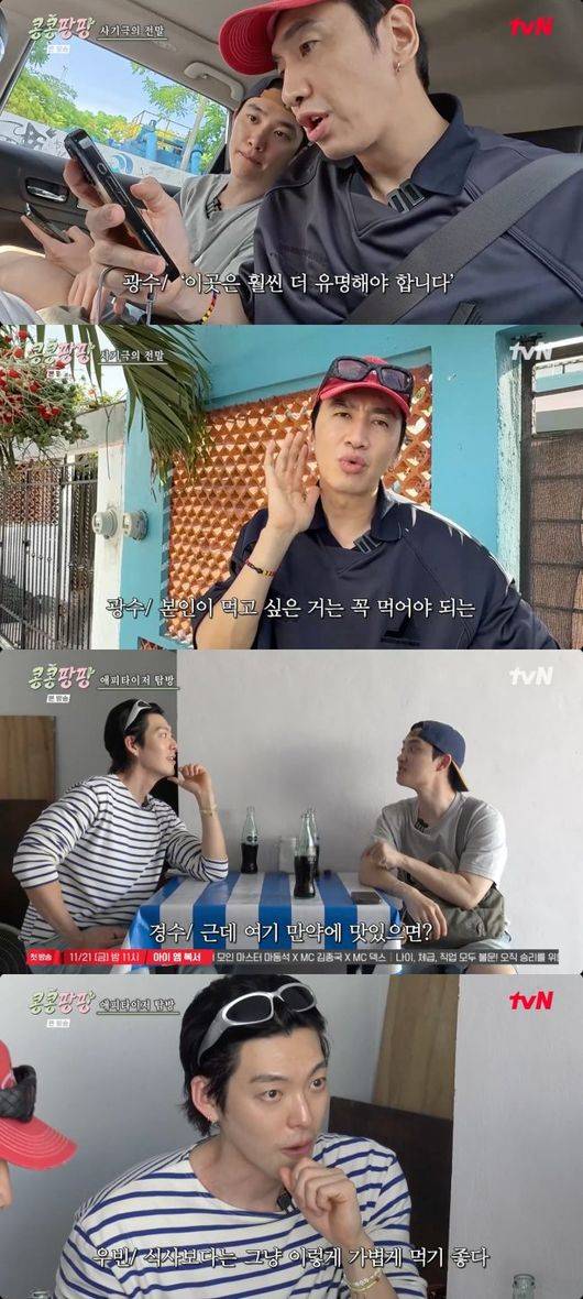 14일 오후에 방송된 케이블채널 tvN 예능프로그램 '콩콩팡팡(콩 심은 데 콩 나서 웃음팡 행복팡 해외탐방)'에서는 도경수가 이광수, 김우빈을 다른 식당으로 안내하는 내용이 그려졌다.