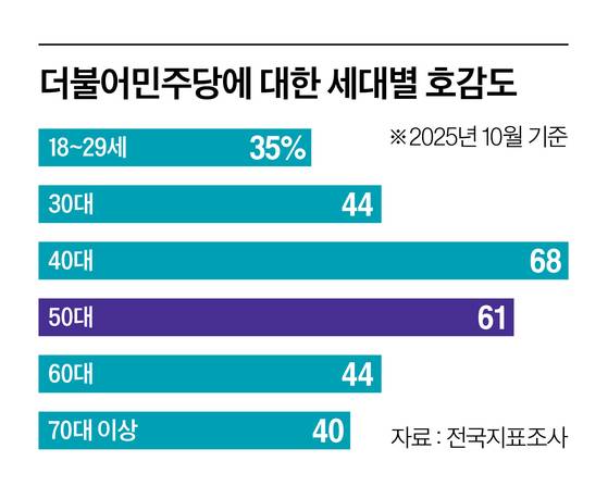 엠브레인퍼블릭·케이스탯리서치·코리아리서치·한국리서치의 전국지표조사(NBS)는 1년에 두 차례 정당별 호감도를 조사한다. 2020년 8월 민주당에 호감을 가진 30대는 52%로 40대(59%) 다음이었다. 비호감은 42%였다. 5년 2개월 뒤인 지난달 조사에서는 비호감(48%)이 호감(44%)을 앞질렀다. 40대(호감 68%, 비호감 29%)와 대비도 컸다. 30대의 민주·진보 계열 정당 지지율은 2020년 8월 54%(민주당 44%, 열린민주당 4%, 정의당 6%)에서 지난달 36%(민주당 34%, 조국혁신당 2%, 진보당 0%)로 쪼그라들었다.
