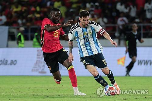 epa12526811 Argentina's Lionel Messi (R) in action against Angola's Show during the international friendly soccer match between Angola and Argentina at the National Stadium in Luanda, Angola, 14 November 2025. EPA/AMPE ROGERIO