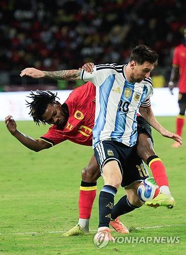 epa12526818 Argentina's Lionel Messi (R) in action against Angola's To Carneiro (L) during the international friendly soccer match between Angola and Argentina at the National Stadium in Luanda, Angola, 14 November 2025. EPA/AMPE ROGERIO