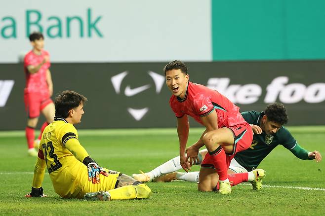 이날 조규성은 1년 6개월 만에 대표팀 유니폼을 입고 경기에 나섰다. 그의 마지막 출전은 지난해 3월 태국전이었다. 무릎 부상과 혈액 감염으로 고생했던 그는 교체 투입 후 자기 역할을 100% 해냈다. 후반 42분 박스 안에서 기회를 놓치지 않고 득점포를 가동했다.