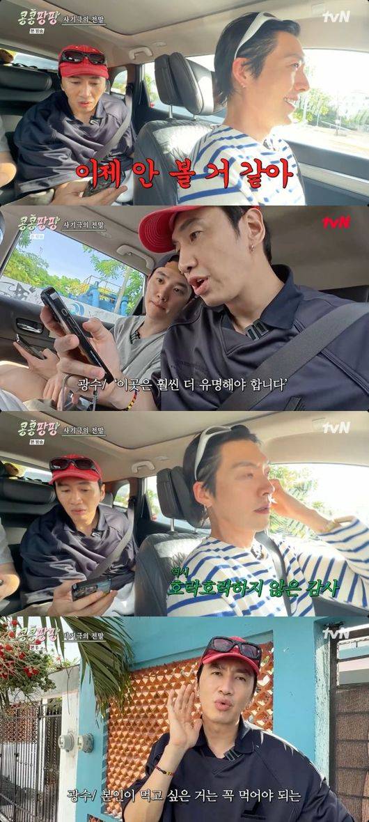 이광수 역시 “믿기지가 않아. 아직 꿈인가? 비행기에서 나 자고 있나”라며, “(도경수) 미친 게 맞는 것 같다. 아무리 생각해도 모르겠다. 본인이 먹고 싶은 것은 꼭 먹어야 하는 그런 병에 걸린 것 같다”라고 토로해 웃음을 줬다.