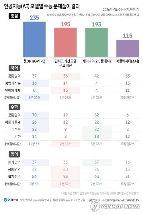 (서울=연합뉴스) 원형민 기자 = 연합뉴스는 15일 연세대 인공지능융합대 첨단융합공학부 김시호 교수 연구팀과 함께 인공지능(AI) 챗GPT(GPT-5), 제미나이(2.5 플래시), 퍼플렉시티(소나), 딥시크 최신 모델의 무료 버전을 대상으로 2026년도 수능 국어·영어·수학 영역을 풀어보게 했다.