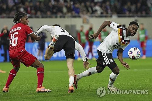 epa12527103 Ridle Baku of Germany (R) in action during the FIFA World Cup 2026 Group A qualification match between Luxembourg and Germany in Luxembourg, Luxembourg, 14 November 2025. EPA/RONALD WITTEK