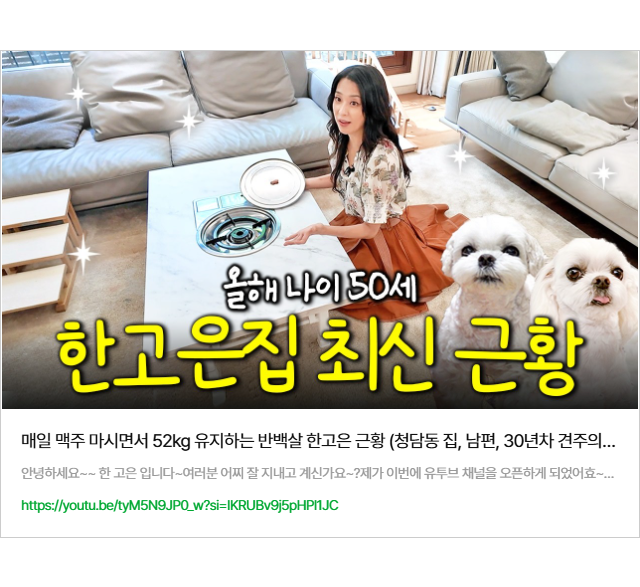 오직 반려견의 편의와 건강만을 위해 꾸며진 한고은 씨의 집. 지난 자신의 모습에 반성하고, 현재에 최선을 다하는 모습이 존경스럽습니다. 앞으로도 유튜브 채널을 통해 신비, 하루와 함께하는 모습을 많이 보여주시길 기대하겠습니다.