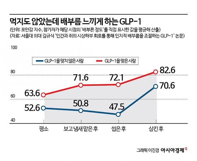 이런 작용이 겹치면서 음식 한입 넣기 전부터 포만감이 올라가는 현상이 생긴다. 실제 연구에서도 GLP-1을 투여한 군은 '음식을 보기 전' 단계에서 이미 위약군보다 약 40% 높은 포만감 지수를 보였다. 기자가 2주차 이후 경험한 '음식을 보기만 해도 배부르다'는 체감은 바로 이 생리적 변화의 결과다.