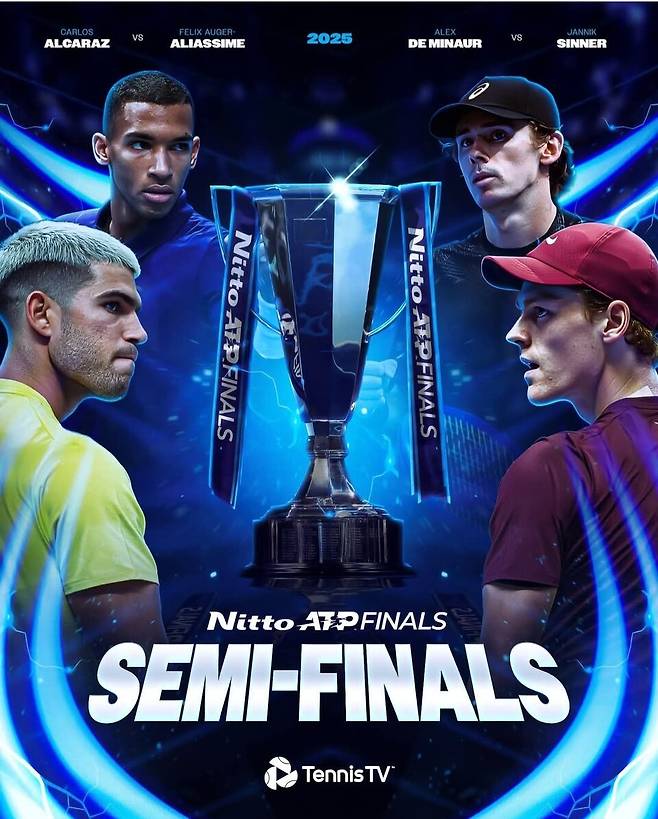 이로써 라운드 로빈 방식의 이번 대회에서 시너는 '지미 코너스 그룹'에서 1승2패 2위를 차지한 세계 7위 알렉스 드 미노(26·호주), 알리아심은 3전 전승 1위를 한 세계 1위 카를로스 알카라스(22·스페인)와 결승 진출을 다투게 됐다.