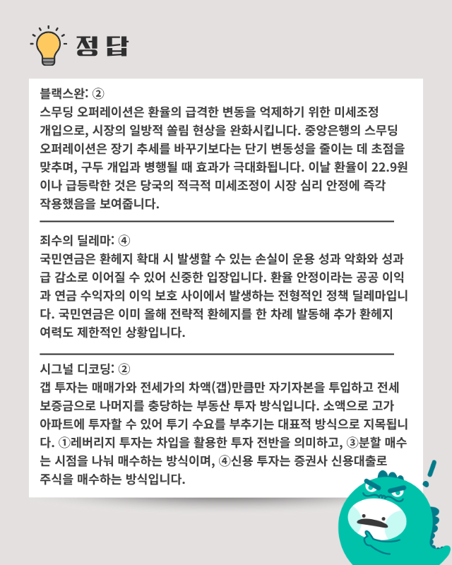 - 핵심 요약: 원·달러 환율이 장 초반 1474.9원까지 치솟았으나 구윤철 부총리의 국민연금·수출기업과의 환율 안정 방안 마련 발표로 1450원대 중반까지 내려갔다. 이날 외국인이 유가증권시장에서 2조 3473억 원 순매도에 나서며 원화 강세 요인이 상당 부분 상쇄됐고 엔저 흐름에 동조해 원화 약세가 지속될 것으로 보인다. 한편 국민연금이 환헤지를 확대할 경우 필요한 달러는 한은과의 연간 한도 650억 달러 규모 통화스와프를 통해 조달할 수 있으며 현재 한도는 아직 남아 있는 것으로 파악된다.