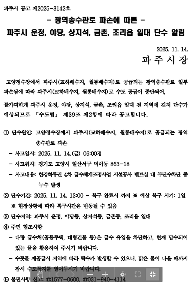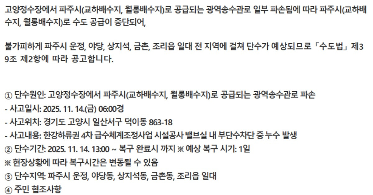 단수 지역은 파주시 운정, 야당동, 상지석동, 금촌동, 조리읍 일대다.