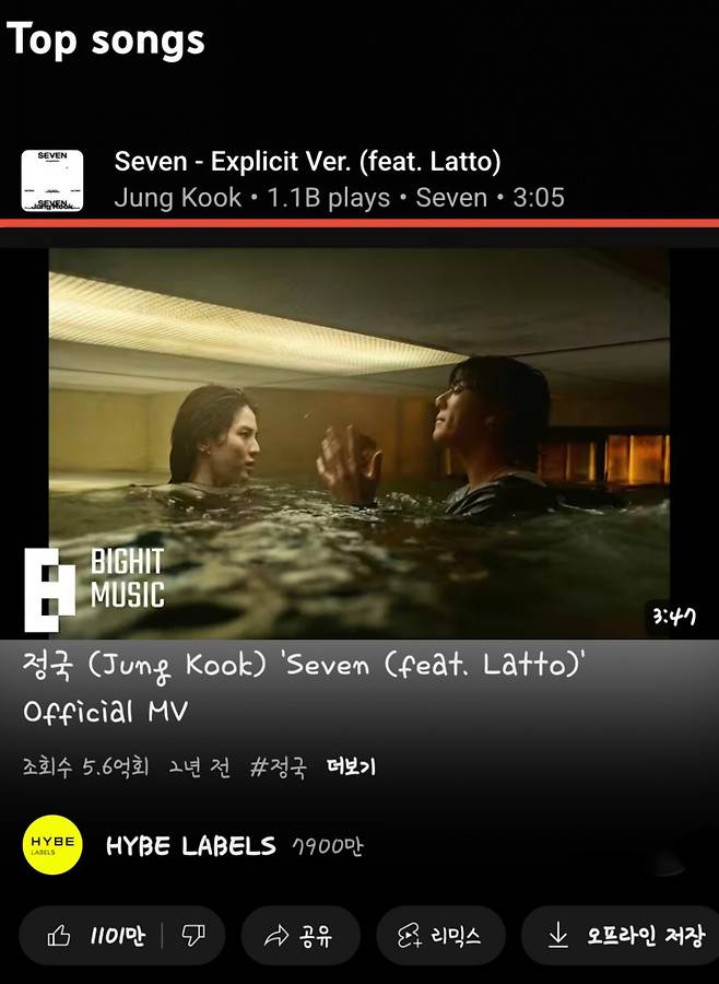 ‘Seven’은 2023년 공개된 이후 시간이 꽤 흘렀지만, 정국의 음원은 여전히 전 세계 리스너들 사이에서 가장 강력한 재생력을 가진 곡 중 하나로 남아 있다. 유튜브 뮤직 누적 재생 수가 11억을 넘긴 것은 그 영향력이 지금도 유효하다는 방증이다.