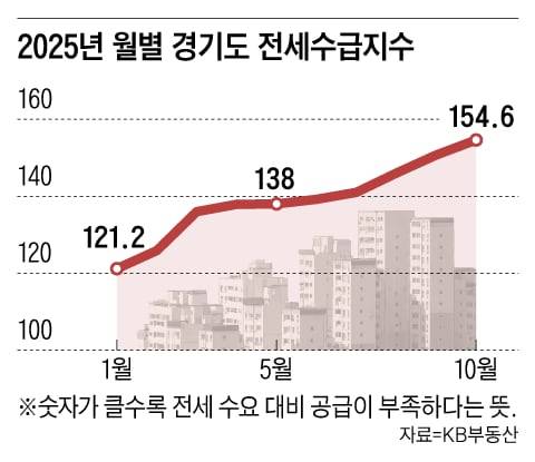 KB부동산이 집계한 경기도 전세 수급 지수 역시 올해 6월 139.2에서 10월 154.6으로 치솟았다. 2021년 10월(158.5) 이후 4년 만에 최고치다. 100을 초과해 숫자가 커질수록 전세 수요 대비 공급 부족이 심각하다는 의미다.